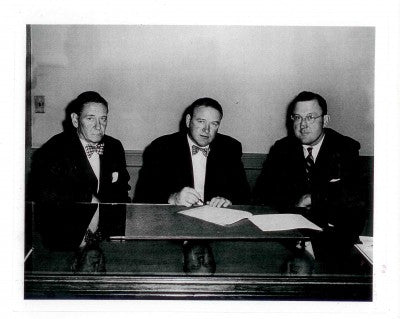 Joseph Cronin, General Manager of the Boston American League Club, and Carl W. Haffenreffer, Treasurer of Narragansett Brewery, Robert B. Choate, President of Station WHDH - key station of the Narragansett Baseball Network, completed the negotiations at the Fenway Park offices.