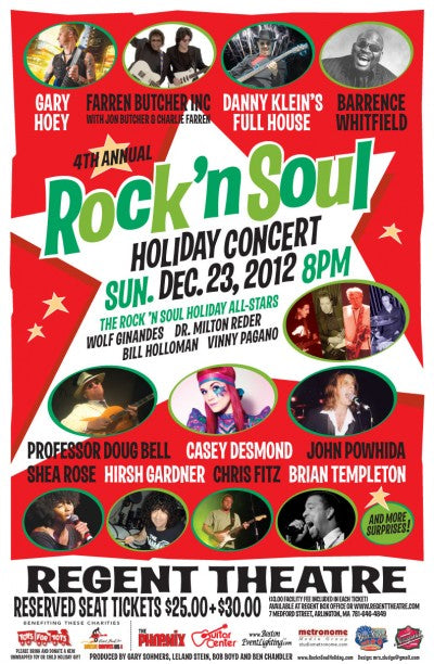 The Rock ‘n’ Soul Holiday Benefit Concert features many New England Performers, this year including Gary Hoey, Charlie Farren, Jon Butcher, Danny Klein’s Full House and Casey Desmond, plus Barrence Whitfield, Professor Doug Bell, Hirsch Gardner, Chris Fitz, John Powhida and Brian Templeton with The Rock n Soul Holiday All Star Band featuring Wolf Ginandes, Bill Holloman, Dr. Milton Reder, Vinny Pagano, along with more talent yet to be announced.