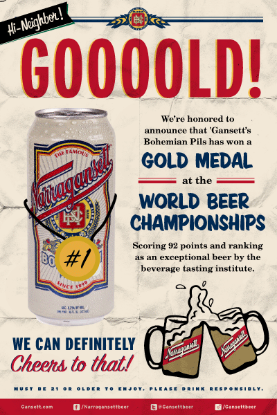 It comes with great pride to announce that 'Gansett's Bohemian Pils has won a gold medal at the World Beer Championships. The brew received 92 points and is ranked as an exceptional beer by the Beverage Tasting Institute that runs the competition. Look for this beer on shelves and in bars near you this Holiday season. Hi neighbor, have an award winning 'Gansett Bohemian Pils!
