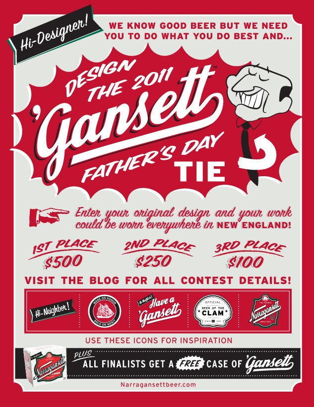 The Narragansett beer 4th annual Father's Day tie design contest is officially underway. We need you to design the next Narragansett Father’s Day tie. Designers, artists and everyone creative, submit a design, and if we like it, you could win money. The winning tie will even be distributed to package stores throughout New England for our 2011 Father’s Day promotion. The only stipulation is that the tie must incorporate Narragansett beer elements and imagery. We aren’t just looking for the most attractive tie. All ties will be judged on creativity, wearability and ’Gansettness. So what are you waiting for?