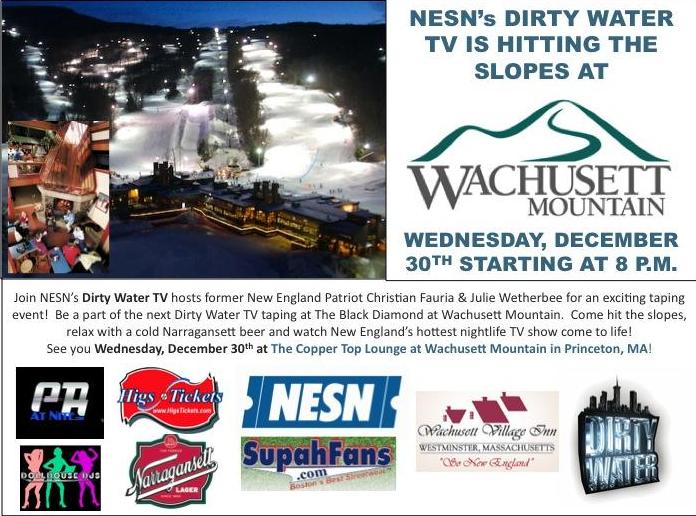 Join NESN's Dirty Water TV hosts former New England Patriot Christian Fauria & Julie Whetherbee for an exciting taping event! Be a part of the next Dirty Water TV taping at The Black Diamond at Wachusett Mountain. Come hit the slopes, relax with a cold Narragansett and watch New England's hottest nightlife TV show come to life! See you Wednesday, December 30th at The Coppertop Lounge at Wachusett Mountain in Princeton, MA.
