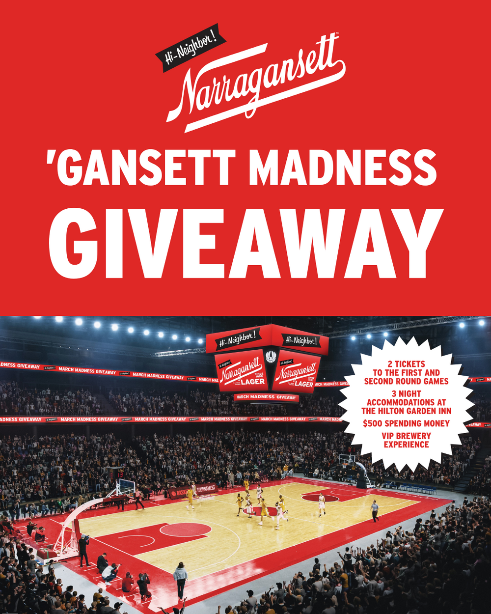 Do you love basketball and Narragansett Beer? Lucky for you, we are giving away 2 tickets to the first two games of March Madness at the Amica Mutual Pavilion in Providence, $500 in spending money, a 3-night stay at the Hilton Garden Inn (right next to our brewery), and VIP brewery experience!