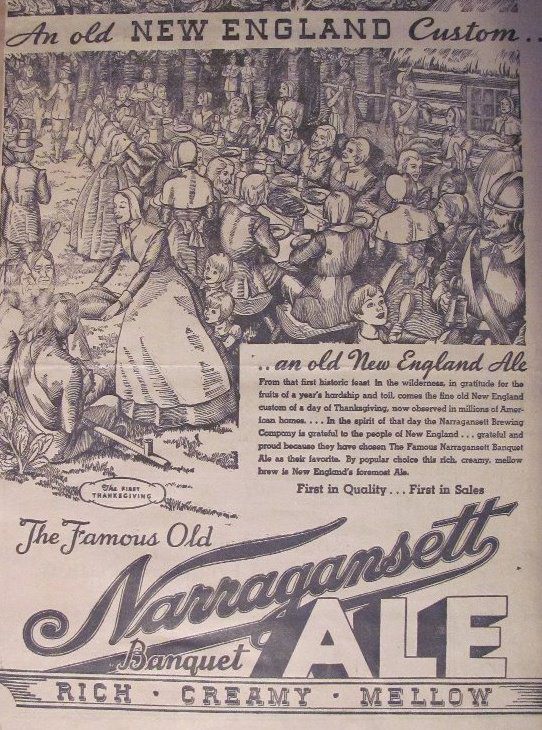 An old New England custom... an old New England beer. From that first historic feast in the wilderness, in gratitude for the fruits of a year's hardship and toil, comes the fine old New England custom of a day of Thanksgiving, now observed in millions of American homes. In the spirit of the day, Narragansett Beer is grateful to the people of New England and beyond... grateful and proud because they enjoy Narragansett Beer this time of year. So from all of us at Narragansett, Happy Thanksgiving to you and your family this Holiday season. Hi Neighbor, have a 'Gansett!