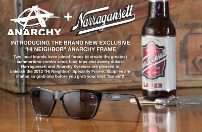 Two local brands have joined forces to create the greatest summertime combo since tube tops and daisy dukes. Narragansett and Anarchy Eyewear are pleased to unleash the 2012 "Hi-Neighbor!" Specialty Frame. Supplies are limited so grab one before you grab your next 'Gansett! Here's a list of the first 10 stores where you can pick up your pair today. B-Eyes Sunglass Shop 227 Water St Block Island, RI 02807 401-466-8676 Breakwater Surf Co. 306 Thames St Newport, RI 02840 401.619.2930 Zapstix Surf & Skate 190 Ocean Blvd Seabrook, NH 03874 603-474-7873 Matunuck Surf Shop 706 Matunuck Beach Rd Matunuck, RI 02879 401.783.2566 Spunky’s Surf Shop 1403 N US1 FT Pierce, FL 34950 772-466-7048 Locals Surf Shop 4050 US Hwy 1 STE 304 Jupiter, FL 33477 561-386-0014 Pump House Surf Shop 9 Cranberry Hwy Orleans, MA 02653 508-240-2226 Narragansett Surf & Skate Shop 74 Narragansett Ave Narragansett, RI 02882 401.789.7890 Music Box 160 Thames St Newport, RI 02840 401-849-6666 Narragansett Bikes 1153 Boston Neck Road Narragansett, RI 02882 (401) 782-4444 NeverBored 9 Cedar Swamp Road Smithfield, Rhode Island 02917 401.231.4212 Not near any of these stores? Purchase them online at AnarchyEyewear.com/Narragansett and our Gansett Gear store! The retail price is just $45.