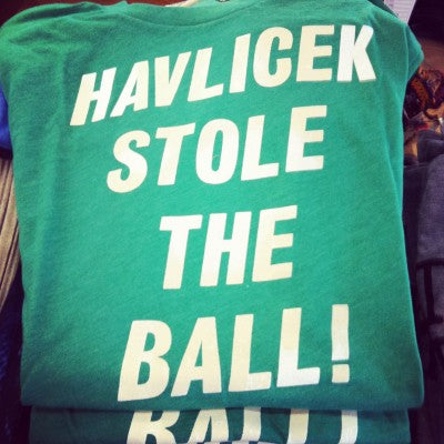 Saw this shirt at Urban last week and realized we made a bottle cap that said the same thing. Ever wonder where it came from? Well here's some Celtics history about their all-time leading scorer with 26,395 points. From NBA.com: It is the most famous radio call in basketball history, hoops' equivalent to Russ Hodges' famed "The Giants win the pennant! The Giants win the pennant!" from baseball's 1951 National League playoffs. There simply is nothing like the gravelly tones of the late Celtics broadcaster Johnny Most describing the closing seconds of Game 7 of the 1965 Eastern Conference Finals between the defending champion Celtics and the Philadelphia 76ers. First, to set the scene: The Celtics' lead had shriveled to 110-109, and Philadelphia regained possession with five seconds left after an inbounds pass attempt by Boston's Bill Russell hit one of the wires that ran down from the ceiling of Boston Garden and helped support the baskets in those days. Hall of Fame guard Hal Greer prepared to toss the ball inbounds under his own basket. The logical target seemed to be massive Wilt Chamberlain in the low post, but Russell fronted Chamberlain and took away that option. K.C. Jones, guarding Greer, leaped along the baseline and frantically waved his arms to distract him as the five seconds ticked away. To get a better view of the court, Greer jumped up and spotted high-scoring forward Chet Walker, seemingly open beyond the key. But Boston's John Havlicek had taken a position several feet off the direct line between Greer and Walker, making it look like Walker was open when he really wasn't. After counting off a couple of seconds in his head, Havlicek sneaked a peek over his shoulder at Greer just as he prepared to release the ball. He moved into the passing lane ... but let Most tell it: "Greer is putting the ball into play. He gets it out deep," Most intones, before his voices rises into a frenzy. "Havlicek steals it. Over to Sam Jones. Havlicek stole the ball! It's all over! Johnny Havlicek stole the ball!" Havlicek tipped the inbounds pass away from Walker and toward teammate Jones, who dribbled out the clock as fans poured onto the court. The Celtics had the win, and would go on to capture their seventh consecutive championship. Havlicek went on to score over 26,000 points in an NBA career that lasted 16 seasons, but he is best remembered for that steal immortalized on tape by the late Johnny Most.