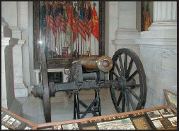 According to thegettysburggun.com, "The original Gettysburg Gun in the picture above stands now in the portico at the Rhode Island State House. At Gettysburg, this gun was a part of the 1st Regiment Rhode Island Light Artillery Battery B. On July 2 and 3, 1863, 'The Gettysburg Gun' was one of the six guns firing on the Confederate positions before 'Pickett's Charge' began. While attempting to load the cannon. a shell hit the bore of the gun at the muzzle and killed the two cannoneers servicing the piece, William Jones and Alfred G. Gardner. The remaining cannoneers led by Sargeant Albert Straight tried to load the cannon but the bore had been damaged badly. In the face of an onslaught of 15,000 Confederates they attempted to load the 12 pound ball into the damaged bore with an axe, but it became stuck and held fast. As the muzzle cooled down the ball became permanently lodged in the mouth of the gun where it still resides today."