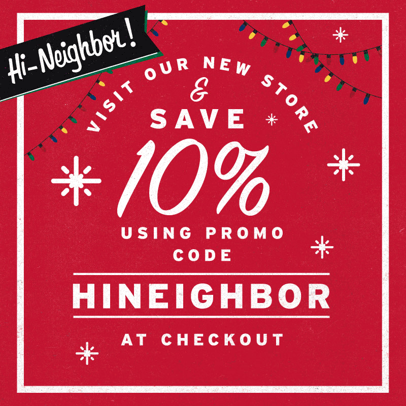 Hi Neighbor! We're excited to announce our brand new online shop just in time for the holidays! Not only is our new store easier to shop, but we have new lower shipping costs, more products, and shipping is FREE when you spend $50 or more!