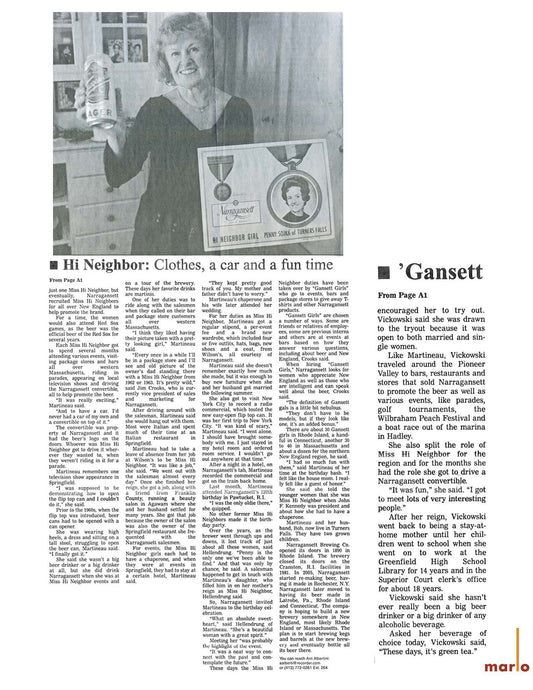 Greenfield woman drove the hills promoting Narragansett beer BY ARN ALBERTINI RECORDER STAFF GREENFIELD -- In 1963, the year after Penny Martineau was one of Narragansett Beer's Miss Hi Neighbor...