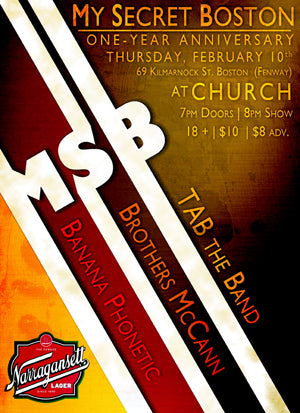 MySecretBoston is celebrating their first birthday, and they're throwing a party for you. Join Gansett and MySecretBoston this Thursday, February 10, at Church, with not one, but three bands: TAB the Band, Banana Phonetic, and Brothers McCann. With...