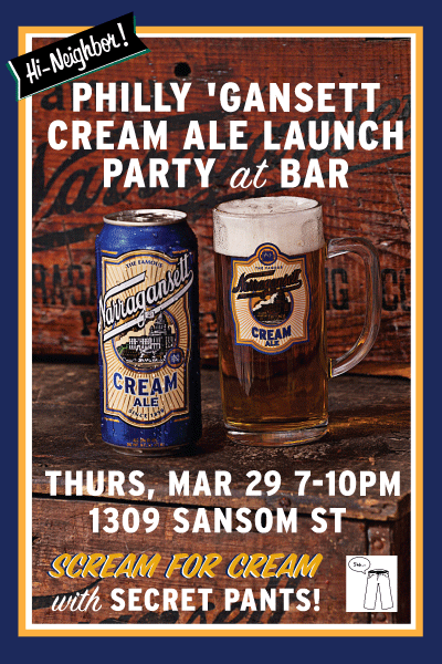 Join us at the launch party on Thursday, March 29th from 7 -- 10 PM BAR, 1309 Sansom Street, Philadelphia, PA 19107 You will: Enjoy great specials on Narragansett Cream...