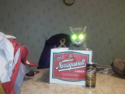Scary! This was a good one since Halloween just passed. Punkin's name isn't far off. Every time the owner is finished stocking the fridge, this mischievous little guy jumps in the box. "These are my Gansett's!" Not really,...