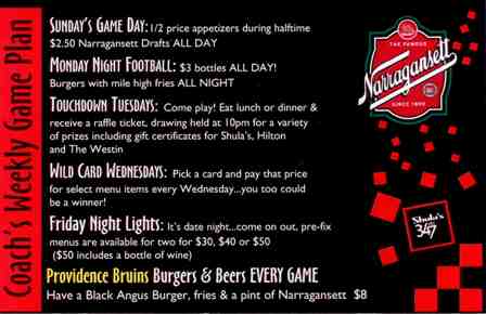 Have a 'Gansett and enjoy the Providence Bruins Hockey. Head to Shula's 347 for a terrific Burgers & Beers special during every game. For just $8 you get a Black Angus burger, fries and a pint of Narragansett...