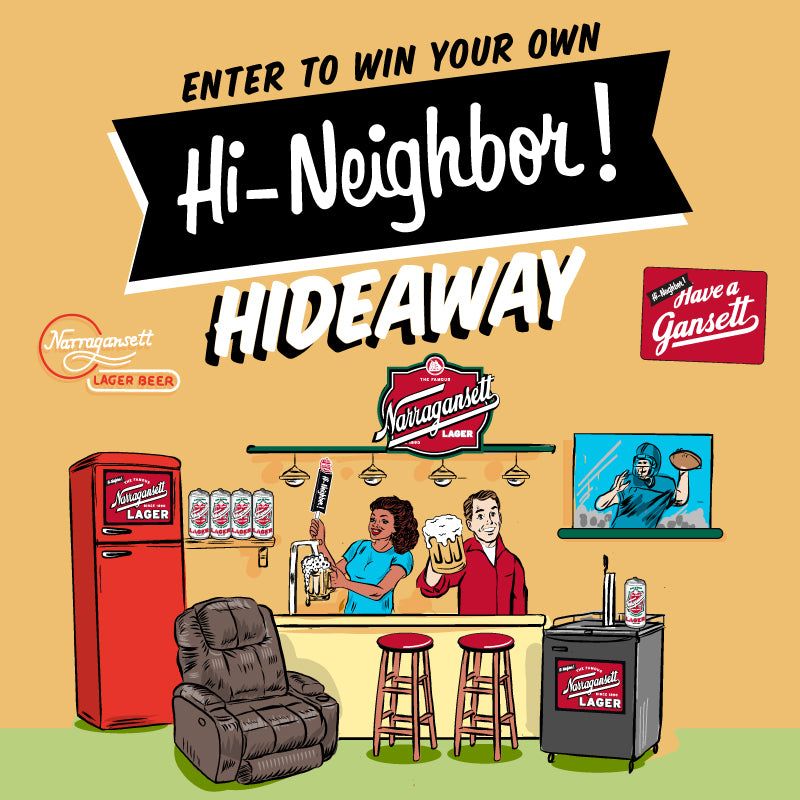 In addition to the weekly Hi Neighbor Hideaway Grand Prize above, winners will receive a pair of ‘Gansett pint glasses, a ‘Gansett beer bucket, a set of our famous rebus puzzle coasters, a ‘Gansett bottle opener, and a Hi Neighbor bumper sticker! Runner-up winners will received everything mentioned above except for the grand prize itself.