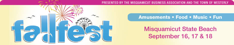 The Misquamicut Business Association (MBA) is pleased to announce the Misquamicut FallFest, Friday September 16th from 5 PM through Sunday September 18th at 5 PM at the Misquamicut State Beach in Westerly, RI. FallFest will include an Outdoor International Food Court, crafters and commercial vendors, Rockwell Amusements with Ferris Wheel and major rides, Circle K petting Zoo, Pony rides, fireworks, a Classic Car Cruise, a race car, street performers, "Kidz on the Go" obstacle course and more! Local and national entertainment including Terry Sylvester of The Hollies and the New Classic Rock All Stars with members of Blues Image, Iron Butterfly, The Knack, Blue Oyster Cult and Steppenwolf will perform. A Beer and Wine Garden, and a Home, Garden and Vacation area will also be featured. A fireworks display will kick off the celebration on Friday night. On Sunday morning Misquamicut will also host the "Surftown Half" which will be a half marathon starting and ending at the Festival. Admission is $5. Parking is $3.Children 3 and under are free. Click here to read more.