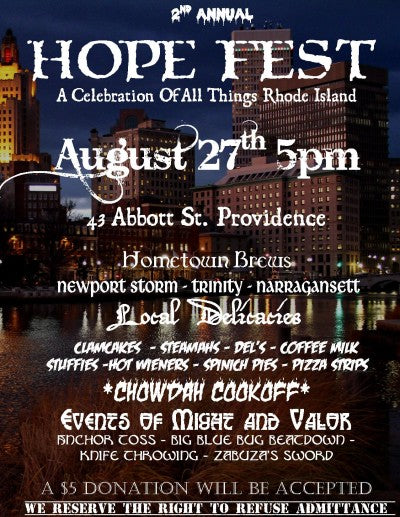 HOPEFEST, it is a celebration of all-things Rhode Island, from food to people to BEER! They will be serving ONLY RI food and drink, with some local-inspired events sure to make some memories. This event is a $5 voluntary donation, and at no point during the night is anyone ever charged for anything. Needless to say, it is well worth it for probably one of the funnest things going on in the summer, with friends and neighbors from far and wide returning to embrace their RI roots.