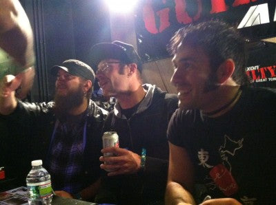 [caption id="attachment_24471" align="alignnone" caption="Killswitch Engage signing autographs and throwing back Gansetts."]
