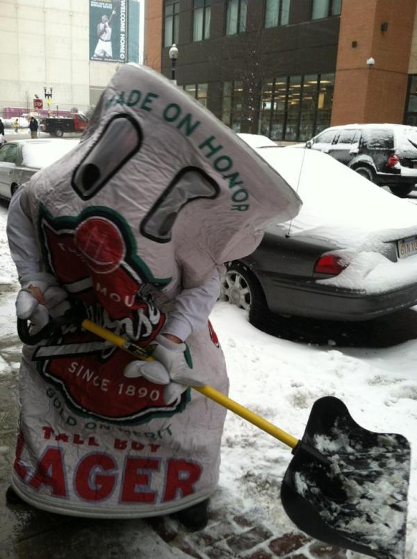 We got our first snowstorm of the 2012 season here in New England this past weekend. So Tall Boy lend a helping hand shoveling the walkway by The Fours for the Bruins game on Saturday afternoon. Then he went inside with the Gansett Girls for some beers and other goodies. Check out the photos below.