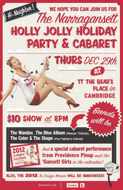 It's that time of year again. We're throwing a Holly Jolly Holiday party the only way we know. Rhody Style. With live music, prizes from Anarchy Eyewear, Gansett Girls, Gansett Gear, the FNX crew and tons of Gansett beers to enjoy. And it just so happens to be our 121st Birthday. So party on. We'll have food trucks outside and all sorts of fun prizes. So mark your calendar now for Thursday, December 29 at TT The Bear's Place in Cambridge. Doors at 8pm and it's only $10. Here are the bands: