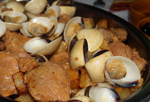 6.Add the clams on top of the pork, distributing them as evenly as possible and cook about 20 minutes or until they open.