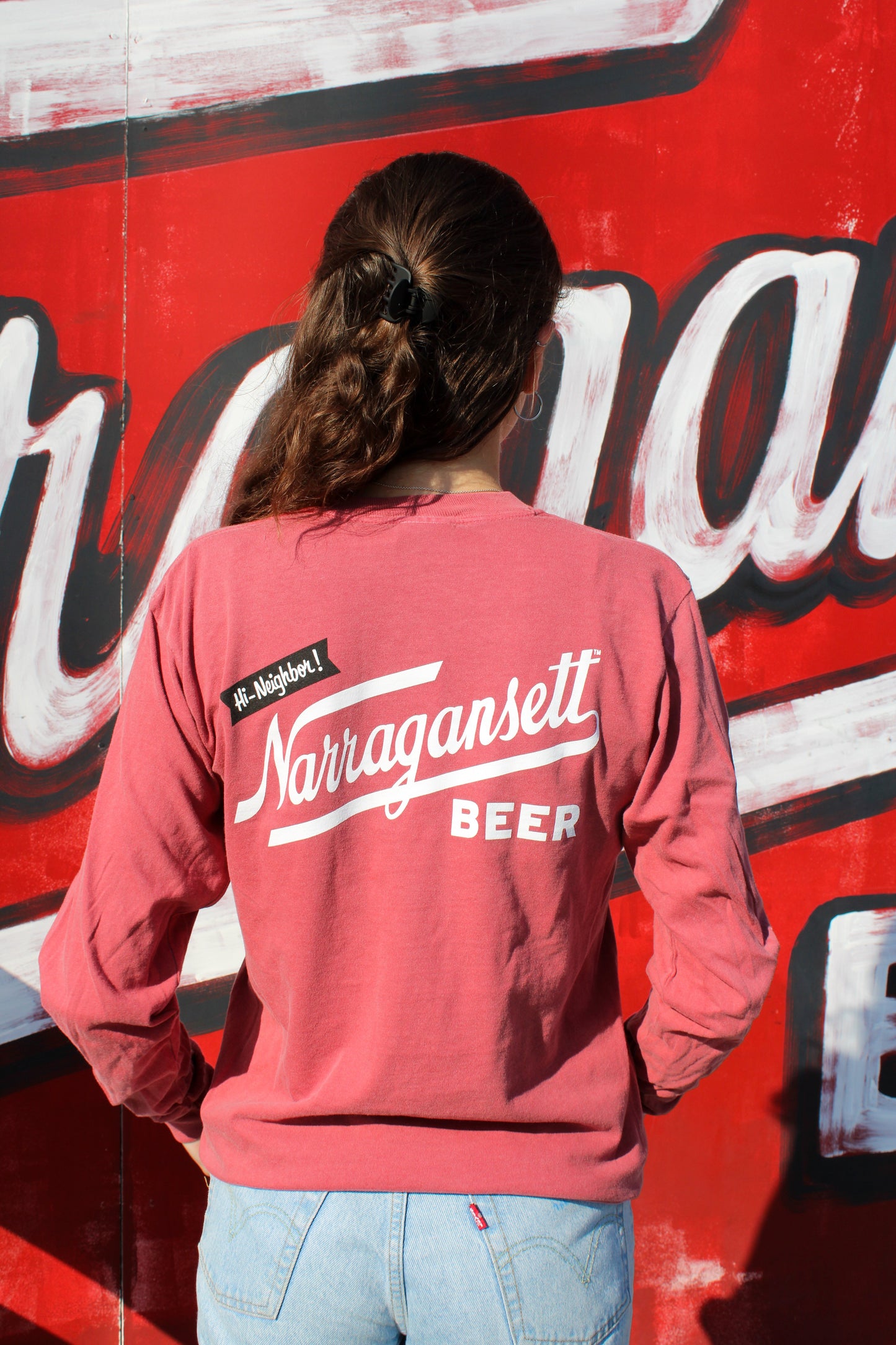 Introducing your new go-to tee - the Long Sleeve Comfort Color Hi Neighbor Tee in Maroon. Made with soft fabric and featuring the iconic Narragansett Beer logo, this tee offers both comfort and style. Perfect for any occasion, from a casual hangout with friends to a night out at the bar. Cheers to looking and feeling great!
